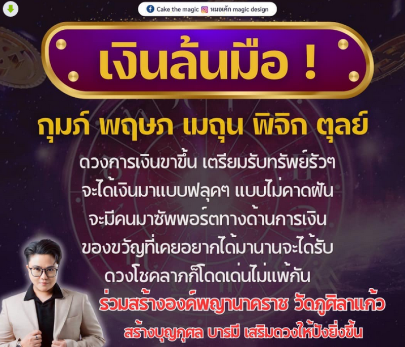 จากกรณีหมอดูชื่อดังอย่างหมอเค้ก ได้ออกมาโพสต์เพจ หมอเค้กMagic Design เผยถึงดวงชะตาราศี สำหรับ 5 ราศี จะได้เงินมาแบบฟลุ๊คๆ แบบไม่คาดฝัน จะมีคนมาซัพพอร์ตทางด้านการเงิน ของขวัญที่เคยอยากได้มานานจะได้รับ ดวงโชคลาภก็โดดเด่นไม่แพ้กัน