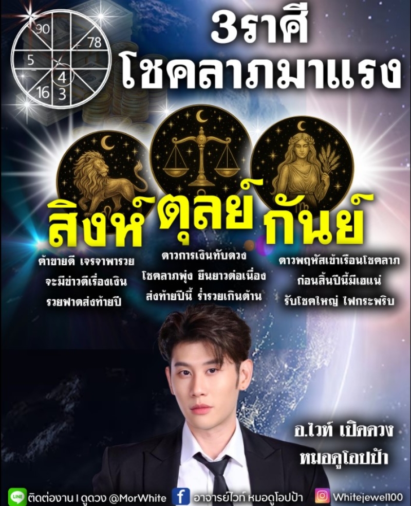 วันที่ 27 ก.ย. อาจารย์ไวท์ หมอดูโอปป้า เปิด 3 ราศี โชคลาภมาแรง ได้แก่ ชาวราศี สิงห์ ตุลย์ กันย์