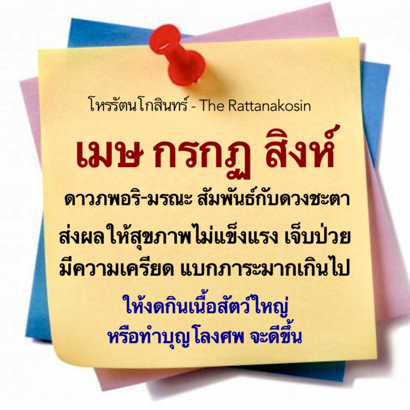 เมษ กรกฏ สิงห์ ดาวภพอริ-มรณะ สัมพันธ์กับดวงชะตา ส่งผลให้สุขภาพไม่แข็งแรง เจ็บป่วย มีความเครียด แบกภาระมากเกินไปให้งดกินเนื้อสัตว์ใหญ่หรือทำบุญโลงศพ จะดีขึ้น