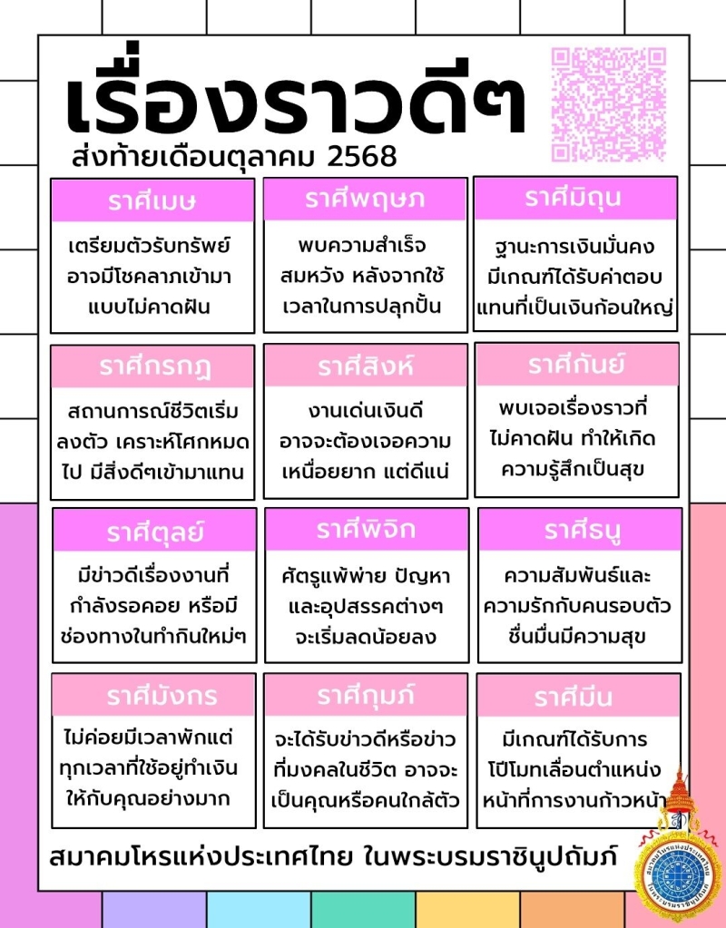 วันที่ 22 ต.ค. 68 ที่ผ่านมา สมาคมโหรแห่งประเทศไทย ในพระบรมราชินูปถัมภ์ เผยดวงชะตาราศี เรื่องราวดีๆ ส่งท้ายเดือนตุลาคม 2568 เตรียมตัวรับทรัพย์ อาจมีโชคลาภเข้ามา แบบไม่คาดฝัน ศัตรูแพ้พ่าย ปัญหาและอุปสรรคต่างๆจะเริ่มลดน้อยลง งานเด่นเงินดี อาจจะต้องเจอความเหนื่อยยาก แต่ดีแน่