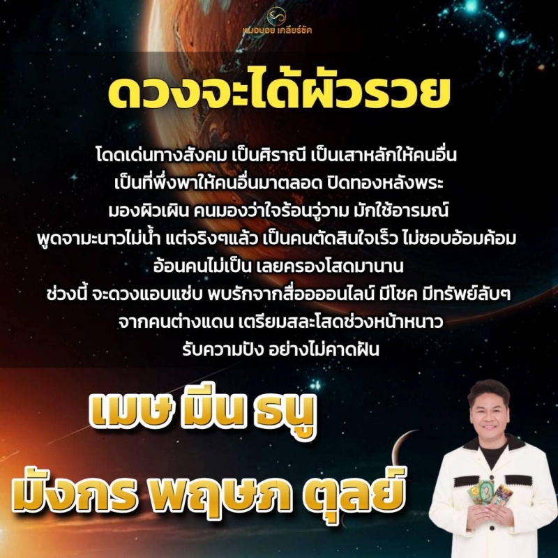 ล่าสุดนักพยากรณ์ชื่อดังอย่าง หมอบอย เคลียร์ชัด ได้ออกมาทำนายดวง 6 ราศี ดวงจะได้ผัวรวย ระบุว่า โดดเด่นทางสังคม เป็นศิราณี เป็นเสาหลักให้คนอื่นเป็นที่พึ่งพาให้คนอื่นมาตลอด ปิดทองหลังพระ มองผิวเผินคนมองว่าใจร้อนวู่วาม มักใช้อารมณ์พูดจามะนาวไม่น้ำ แต่จริงๆเเล้วเป็นคนตัดสินใจเร็ว ไม่ชอบอ้อมค้อม อ้อนคนไม่เป็น เลยครองโสดมานาน ช่วงนี้ดวงจะแอบฉว่บ พบรักจากสื่ออนไลน์มีโชคมีทรัพย์ลับๆจากคนต่งแดน เตรียมสละโสดช่วงหน้าหนาวรับความปัง อย่างไม่คาดฝัน