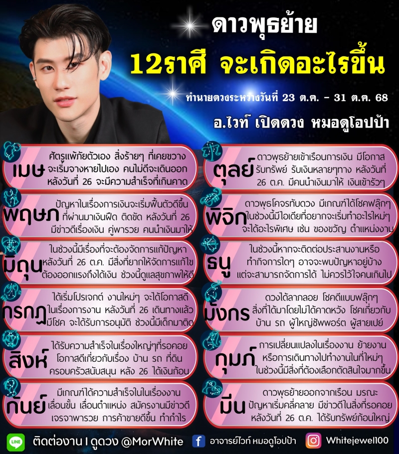 ล่าสุดนักพยากรณ์ดังอย่าง หมอไวท์ พบ 6 ราศี มีโชค หลัง 26 ต.ค. ดวงได้รับทรัพย์ก้อนใหญ่ การเงินเริ่มฟื้นตัวดีขึ้น