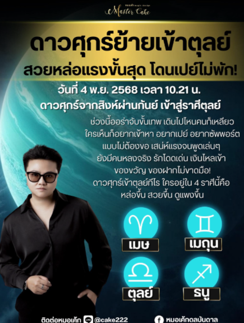 เรียกได้ว่า เป็นช่วงเวลาที่พลังจักรวาลขยับครั้งใหญ่ ส่งผลให้หลายราศีมีเรื่องให้ยิ้มออก เฉพาะเมื่อ ดาวศุกร์ เคลื่อนเข้าสู่ราศีตุลย์ในวันที่ 4 พฤศจิกายน 2568 เวลา 10.21 น. งานนี้ หมอเค้ก ดวงดลบันดาล เผยว่า จะเกิดการเปลี่ยนแปลงด้านเสน่ห์ เงินทอง และความรักแบบเห็นผลชัด