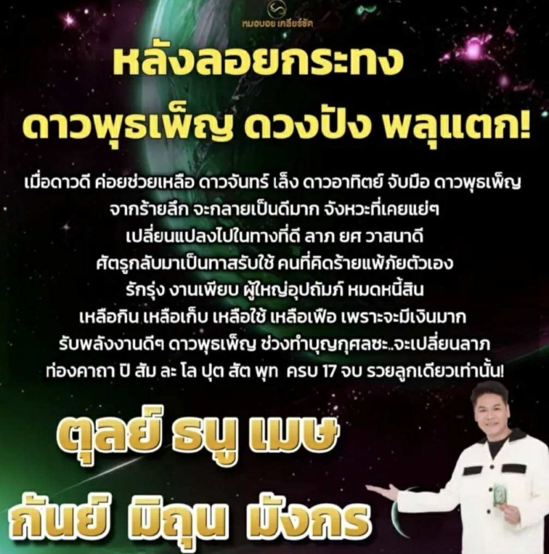 โดย หมอบอย เผยว่า การโคจรของดาวพุธในคืนเพ็ญครั้งนี้ ถือเป็นจุดเปลี่ยนสำคัญ เพราะพลังจากดาวดีหลายดวงมาบรรจบกัน ส่งผลให้เส้นทางชีวิตเริ่มเปิดกว้าง ความติดขัดจะคลี่คลาย และสิ่งที่รอคอยมีโอกาสสมหวัง เฉพาะเรื่องการงาน การเงิน และความรักที่เริ่มกลับมาสดใสอีกครั้ง