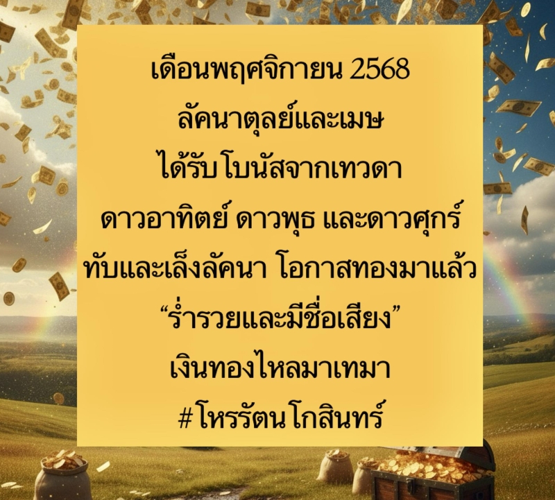 โดย โหร เผยว่า ช่วงเวลานี้ ถือเป็นจังหวะทองของ ลัคนาเมษ และ ลัคนาตุลย์ เพราะดาวสำคัญหลายดวงอย่างอาทิตย์ พุธ และศุกร์ เคลื่อนทับตำแหน่งลัคนาตรงๆ ส่งเสริมให้เกิดพลังแห่งความสำเร็จ มีเกณฑ์รับโชคใหญ่ และ ความมั่งคั่งแบบเกินคาด