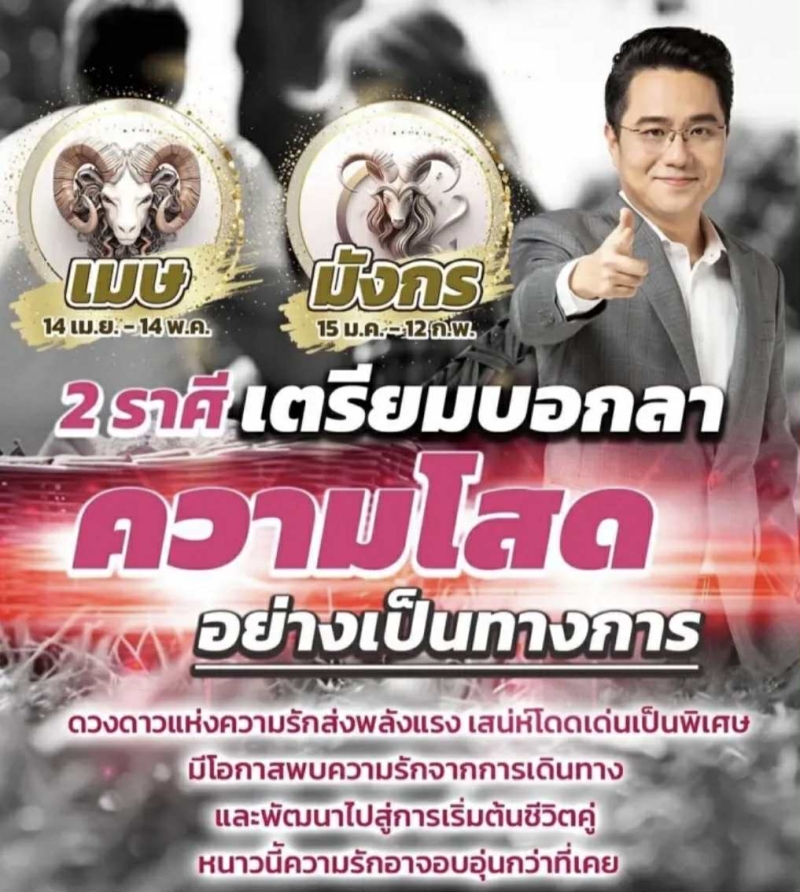 ราศีเมษ (14 เม.ย.-14 พ.ค.) และ ราศีมังกร (15 ม.ค.-12 ก.พ.) มีโอกาสพบเจอคนถูกใจจากกิจกรรมเดินทาง หรือ ทำงานนอกสถานที่ ซึ่งอาจนำไปสู่ความสัมพันธ์ที่จริงจัง และ ต่อยอดสู่ชีวิตคู่ได้