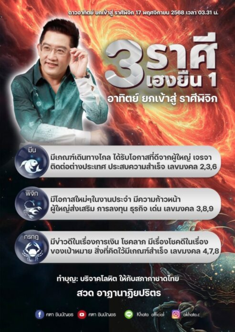 คฑา ชินบัญชร เผยถึง 3 ราศี เฮงยืนหนึ่ง รับดาวอาทิตย์ยกเข้าสู่ ราศีพิจิก 17 พ.ย.2568 เวลา 03.31 น. ราศีใครรายงานตัวจ้า อย่าลืมสวด อาฎานาฎิยปริตร ด้วยกันนะครับ โดย 3 ราศีเฮงยืนหนึ่ง ได้แก่