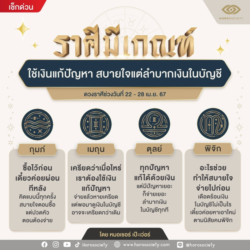 กุมภ์ ซื้อไว้ก่อน เดี๋ยวค่อยผ่อนทีหลัง คิดแบบนี้ทุกครั้ง สบายใจตอนซื้อแต่ปวดหัว ตอนจ่าย เมถุน เครียดว่าเมื่อไหร่ เราต้องใช้เงิน แก้ปัญหา จ่ายแล้วหายเครียด แต่พอมาดูเงินในบัญชี อาจจะเครียดกว่าเดิม