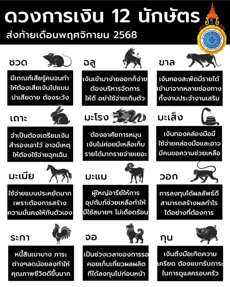 สมาคมโหรแห่งประเทศไทย ในพระบรมราชินูปถัมภ์ เปิดดวงการเงิน 12 นักษัตร ส่งท้ายเดือนพฤศจิกายน 2568 มีดังนี้