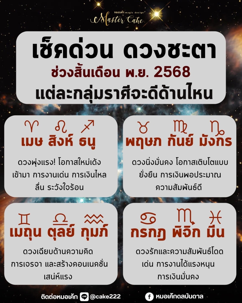 วันที่ 24 พ.ย. 68 ทาง หมอเค้กดลบันดาล เช็กด่วน ดวงชะตา ช่วงสิ้นเดือน พ.ย. 2568 แต่ละกลุ่มราศีจะดีด้านไหน เผย ราศีใด ดวงพุ่งแรง การงานเด่น การเงินไหลลื่น โดยมีรายละเอียดของแต่ละกลุ่มราศีดังนี้
