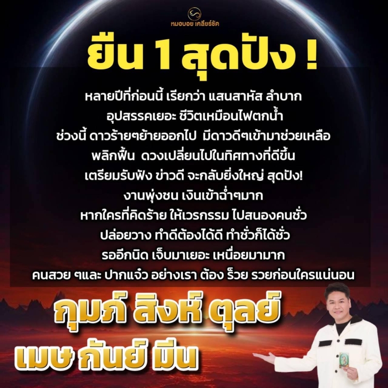 พลิกฟื้น ดวงเปลี่ยนไปในทิศทางที่ดีขึ้น เตรียมรับฟัง ข่าวดี จะกลับยิ่งใหญ่ สุดปัง! งานพุ่งชน เงินเข้าฉ่ำๆมาก หากใครที่คิดร้าย ให้เวรกรรม ไปสนองคนชั่ว ปล่อยวาง ทำดีต้องได้ดี ทำชั่วก็ได้ชั่ว รออีกนิด เจ็บมาเยอะ เหนื่อยมามาก คนสวยๆและ ปากแจ๋ว อย่างเรา ต้อง ร็วย รวยก่อนใครแน่นอน กุมภ์ สิงห์ ตุลย์ เมษ กันย์ มีน