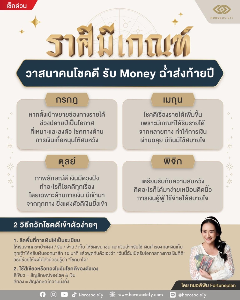 เมื่อวันที่ 25 พ.ย. 68 ที่ผ่านมา ทางเพจ Horosociety หมอพิพิม Fortuneplan เปิด 4 ราศี ยิ่งใกล้ปลายปี มันนี่ยิ่งฉ่ำมาก ได้แก่ กรกฏ เมถุน ตุลย์ พิจิก