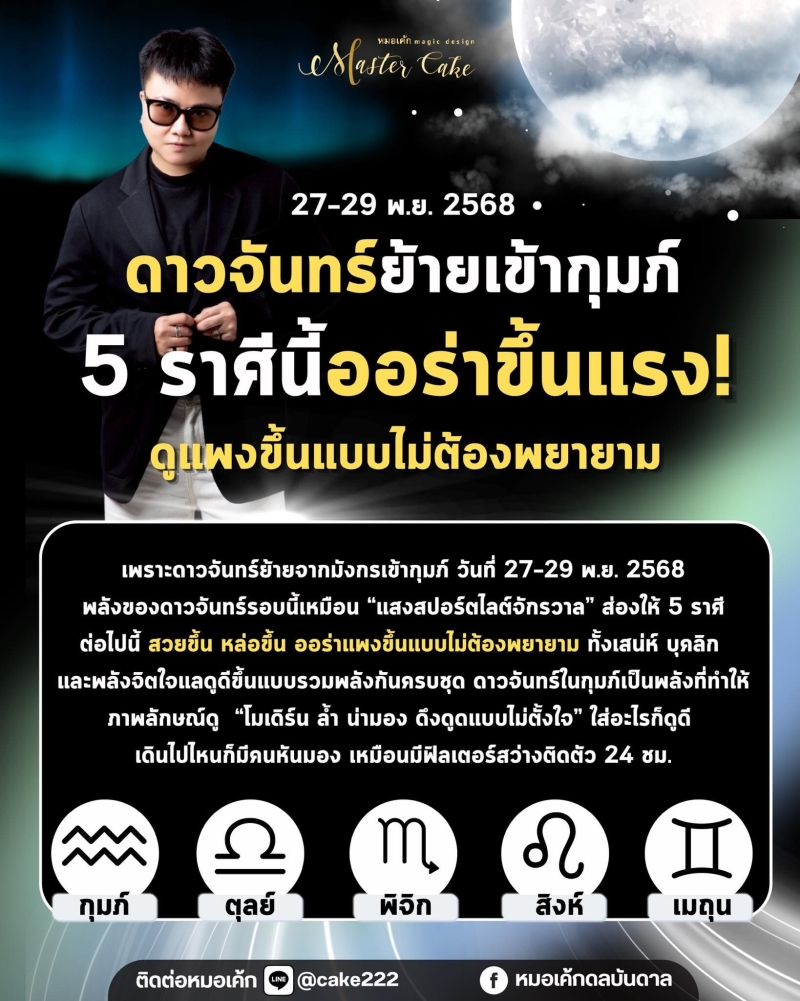 วันที่ 27 พ.ย. 68 ทาง หมอเค้กดลบันดาล เผยถึงดวงชะตาราศี ดาวจันทร์ย้ายเข้ากุมภ์ 5 ราศีนี้ออร่าขึ้นแรง! ดูแพงขึ้นแบบไม่ต้องพยายาม เพราะดาวจันทร์ย้ายจากมังกรเข้ากุมภ์ วันที่ 27-29 พ.ย. 2568