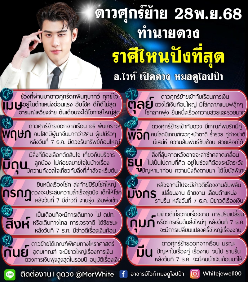 นักพยากรณ์ดังอย่าง หมอไวท์ ได้ดูดวงวันนี้ เตือน 3 ราศี มีสิ่งที่ต้องเลือกตัดสินใจ อยู่ในช่วงที่ต้องระมัดระวังปัญหามาก่อน ความปังถึงตามมา ระบุว่า ดาวศุกร์ย้าย 28 พ.ย. 2568