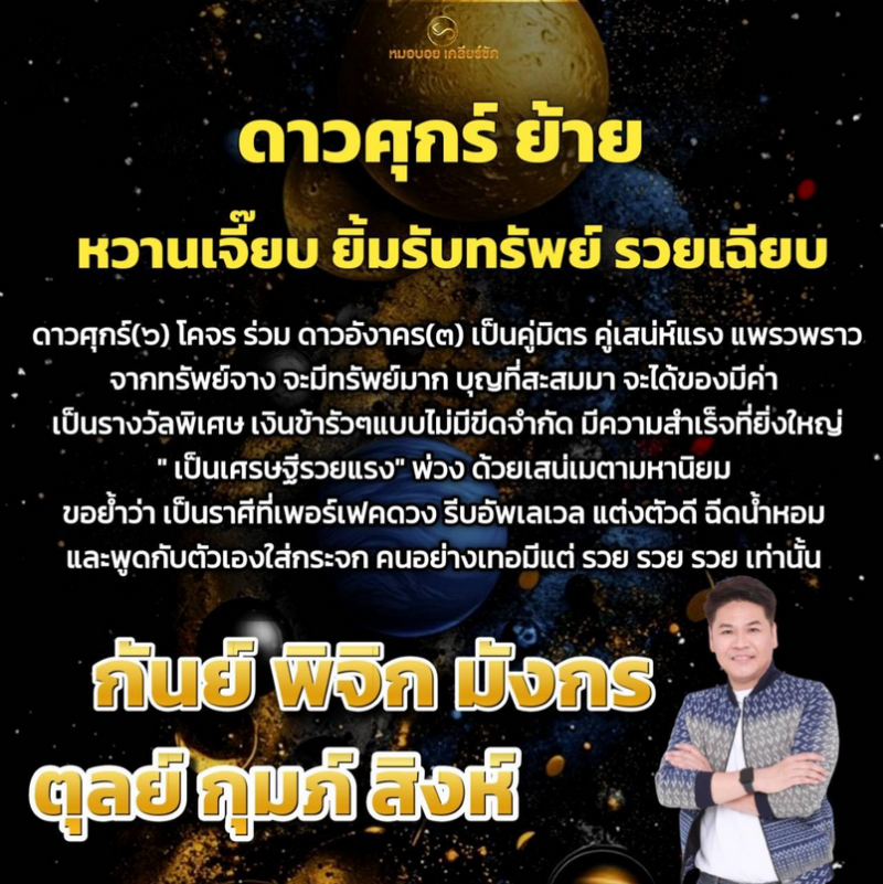 นักพยากรณ์ดังอย่าง หมอบอย เคลียร์ชัด ทำนายดวงชะตา 6 ราศี ยิ้มรับทรัพย์ เป็นเศรษฐีรวยแรง ระบุว่า 6 ราศี ดาวศุกร์ย้าย หวานเจี๊ยบ ยิ้มรับทรัพย์ รวยเฉียบ ดาวศุกร์(๖) โคจรร่วม ดาวอังคาร(๓) เป็นคู่มิตร คู่เสน่ห์แรง แพรวพราว จากทรัพย์จาง จะมีทรัพย์มาก บุญกุศลสะสมมา