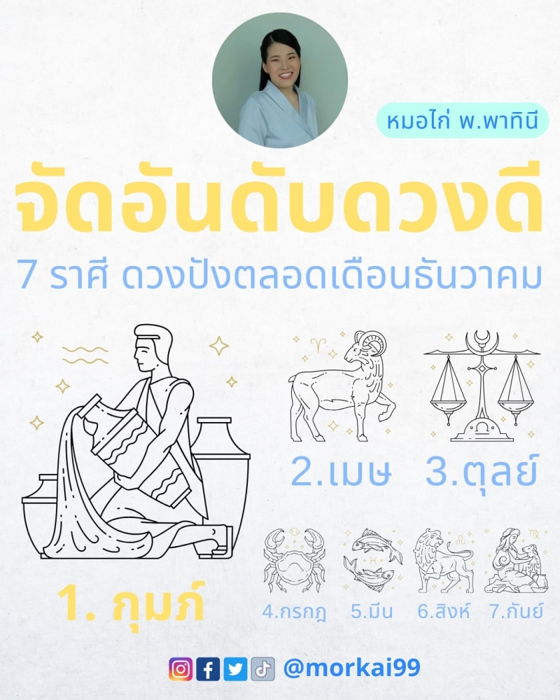 เรียกได้ว่า ตลอดเดือนธันวาคม หมอไก่ พ.พาทินี นักพยากรณ์ชื่อดัง ได้เปิดเผย 7 ราศีที่จะโดดเด่นเรื่องดวงชะตา มีโชค และ ความสำเร็จเข้ามาไม่ขาดสาย