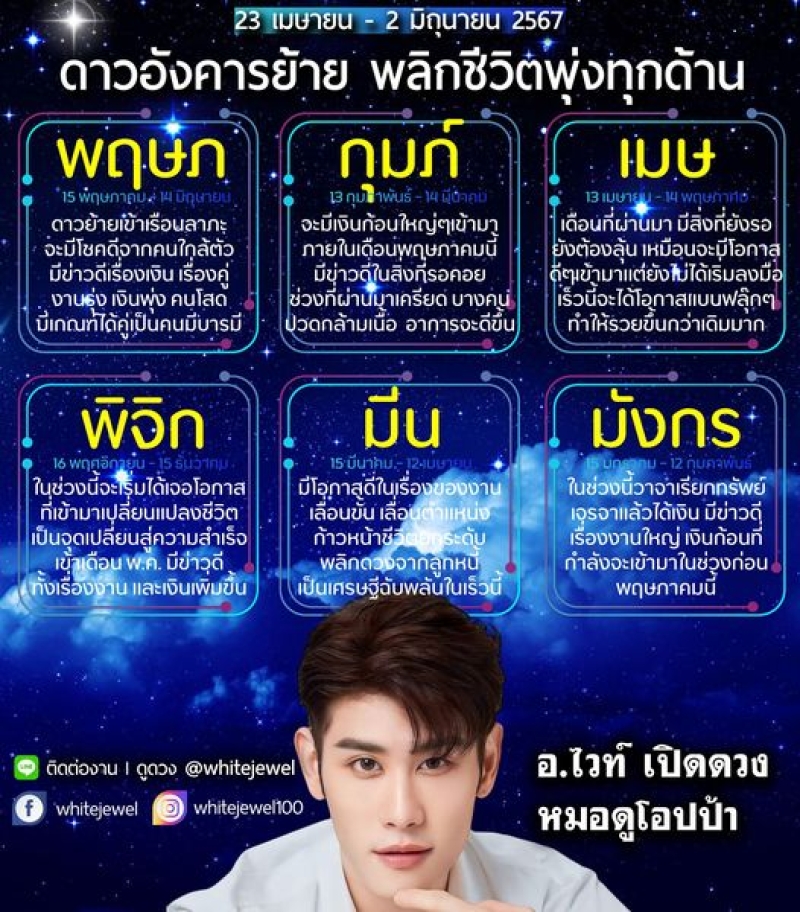 อ.ไวท์ หมอดูโปป้า ได้ทำนายดวงชะตา 6 ราศี ดาวอังคารย้าย พลิกชีวิตพุ่งทุกด้าน ผ่านทางแฟนเพจเฟซบุ๊ก White Jewel โดยได้ระบุว่า "ดาวอังคารย้าย พลิกชีวิตพุ่งทุกด้าน คำทำนายมีผลช่วงระหว่าง 23 เม.ย. - 2 มิ.ย. 2567" โดยได้ระบุคำทำนายไว้ดังนี้