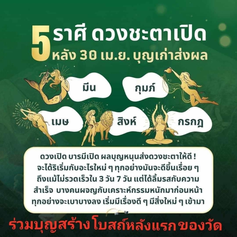 ดวงเปิด บารมีเปิด ผลบุญหนุนส่งดวงชะตาให้ดี จะได้เริ่มกับอะไรใหม่ๆ ทุกอย่างมันจะดีขึ้นเรื่อยๆ ถึงแม้ไม่รวดเร็วภายใน 3 วัน 7 วันแต่ได้ลิ้มรสกับความสำเร็จ บางคนผจญกับเคราะห์กรรมหนักมาก่อนหน้าทุกอย่างจะเบาบางลง เริ่มมีเรื่องดีๆ มีสิ่งใหม่ๆเข้ามาสะสมบุญไว้อย่าให้ขาด
