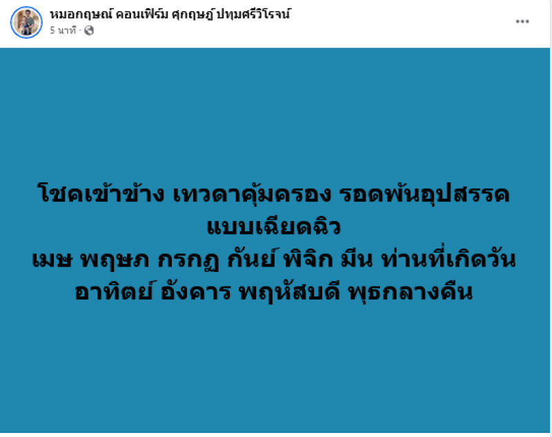 จากกรณีเพจ หมอกฤษณ์ คอนเฟิร์ม ศุกฤษฎ์ ปทุมศรีวิโรจน์ ได้ออกมาโพสต์โดยระบุว่าโชคเข้าข้าง เทวดาคุ้มครอง รอดพ้นอุปสรรคแบบเฉียดฉิว เมษ พฤษภ กรกฏ กันย์ พิจิก มีน ท่านที่เกิดวัน อาทิตย์ อังคาร พฤหัสบดี พุธกลางคืน