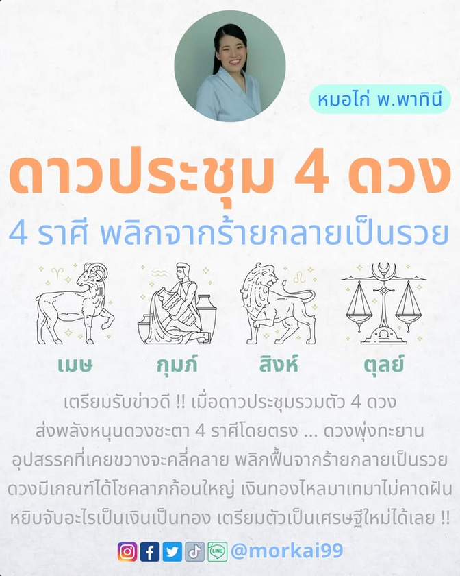 นักพยากรณ์ดังอย่าง หมอไก่ พ.พาทินี ทำนายดวงปรากฏการณ์ดาวชุมนุม 4 ดวง พลิกร้ายกลายเป็นรวย 4 ราศี ดวงพุ่งแรงเกินต้าน ความรวยความสำเร็จใกล้เข้ามาแล้ว พลิกฟื้นจากร้ายกลายเป็นรวย ดวงมีเกณฑ์ได้โชคลาภก้อนใหญ่ เงินทองไหลมาเทมาไม่คาดฝัน หยิบจับอะไรเป็นเงินเป็นทอง เตรียมตัวเป็นเศรษฐีใหม่ได้เลย ซึ่งได้แก่