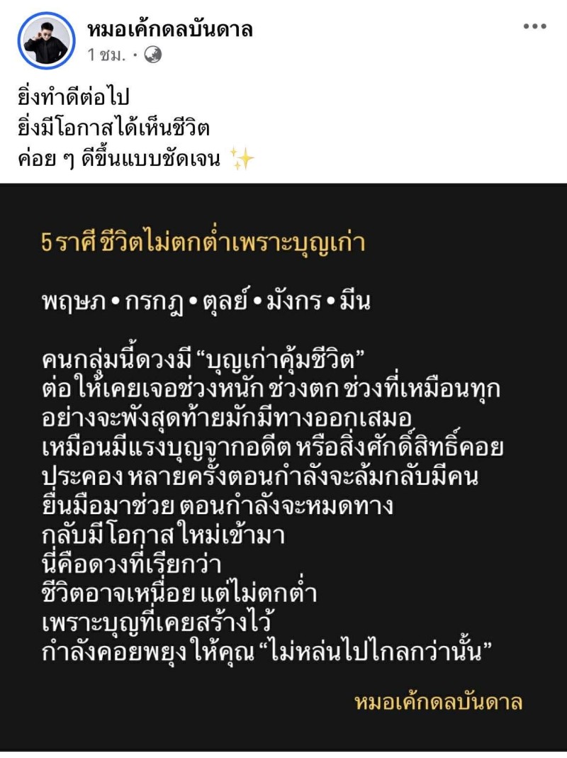 เรียกได้ว่า ทำเอาสายมู และคนที่ชื่นชอบการดูดวงหูผึ่งกันไม่น้อย หลังนักพยากรณ์ชื่อดัง หมอเค้ก ดลบันดาล ออกมาเปิดคำทำนายถึง 5 ราศีที่มีแต้มบุญสูง โดยระบุว่า คนกลุ่มนี้มักมีบุญเก่าคอยหนุนดวง ทำให้ชีวิตไม่ตกต่ำง่ายๆ