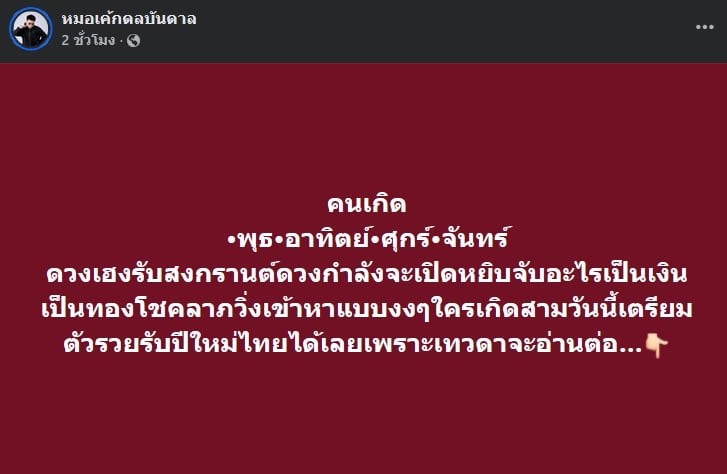 เรียกได้ว่า ช่วงเทศกาลสงกรานต์ปีนี้ ดวงของคนเกิดวันพุธ อาทิตย์ ศุกร์ และจันทร์ กำลังมาแรงแบบฉุดไม่อยู่ มีเกณฑ์รับทรัพย์แบบไม่ทันตั้งตัว