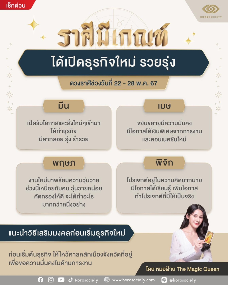 วันที่ 22 พ.ค. 67 ทาง หมอฝ้าย The Magic Queen ได้ออกมาทำนาย คนจะรวยช่วยไม่ได้ อะไรก็ฉุดไม่อยู่ มาดูกันว่าราศีใดบ้างช่วงนี้เปิดธุรกิจใหม่แล้วรุ่ง