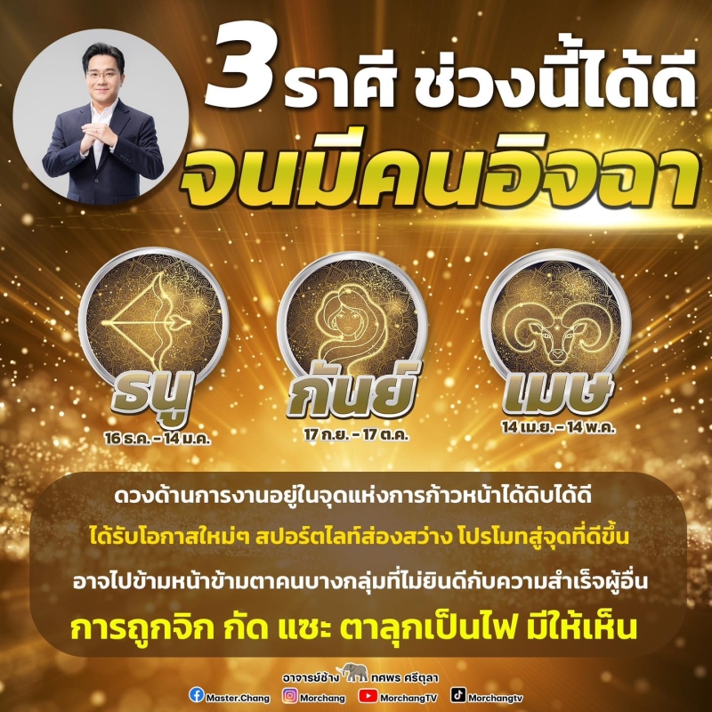 เมื่อวันที่ 23 พ.ค. 2567 ที่ผ่านมา หมอช้าง ทศพร ศรีตุลา เผยคำทำนาย 4 ราศี ช่วงนี้ได้ดีจนมีคนอิจฉา ดวงด้านการงานอยู่ในจุดแห่งการก้าวหน้าได้ดิบได้ดี ได้รับโอกาสใหม่ๆ สปอร์ตไลท์ส่องสว่าง โปรโมทสู่จุดที่ดีขึ้น อาจไปข้ามหน้าข้ามตาคนบางกลุ่ม ที่ไม่ยินดีกับความสำเร็จผู้อื่น การถูกจิก กัด แซะ ตาลุกไฟ มีให้เห็น
