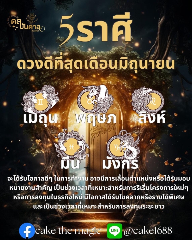 หมอเค้ก Cake The Magic นักพยากรณ์ ทำนายดวงชะตา ทำนายดวง 5 ราศีดวงดีที่สุดในเดือนมิถุนายน โดยได้โพสต์ผ่านทางแฟนเพจเฟซบุ๊ก Cake The Magic โดยได้ทำนายไว้ดังนี้
