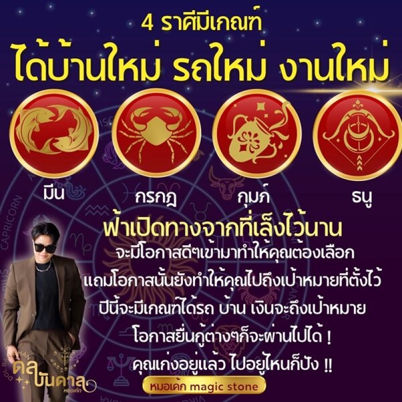 หมอเค้ก Magic stone เปิดชะตา 4 ราศีมีเกณฑ์ได้บ้านใหม่ รถใหม่ งานใหม่ เผย ฟ้าเปิดทางจากที่เล็งไว้นาน จะมีโอกาสดี ๆ เข้ามา ประกอบด้วย ราศีมีน ราศีกรกฎ ราศีกุมภ์ และ ราศีธนู