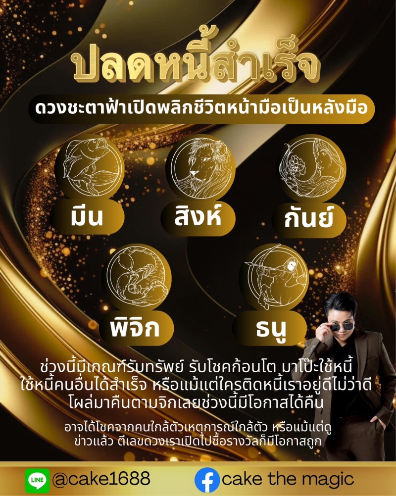 จากกรณีหมอเค้ก Cake The Magic นักพยากรณ์ ทำนายดวงชะตา 5 ราศีปลดหนี้สำเร็จ ดวงชะตาเปิดพลิกชีวิต หน้ามือเป็นหลังมือ โดยได้โพสต์ผ่านทางแฟนเพจเฟซบุ๊ก Cake The Magic โดยได้ทำนายไว้ดังนี้