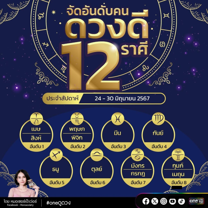 วันที่ 24 มิ.ย. 67 ที่ผ่านมาHorosociety หมอเชอร์ เป๊ะเว่อร์ นักโหราศาสตร์ชื่อดังและดูดวง ได้จัดอันดับคนดวงดี 12 ราศี ประจำสัปดาห์ที่ 24 – 30 มิ.ย. 67 มาดูดวงกันว่าดวงชะตาราศีของท่านอยู่อันดับต้น ๆ หรือจะมีเรื่องดี ๆ เรื่องใดบ้าง