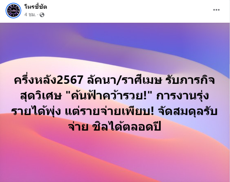 เมื่อวันที่ 23 มี.ค. 2567 ที่ผ่านมา ทางเพจ โหรชี้ชัด ได้ออกมาทำนายดวงแค่ 1 ลัคนา/ราศี เท่าเท่านั้น ค้นฟ้าคว้ารวย!" การงานรุ่ง รายได้พุ่ง แต่รายจ่ายเพียบ! ในช่วงครึ่งปีหลัง 2567 โดยกล่าวคำทำนายไว้ดังนี้