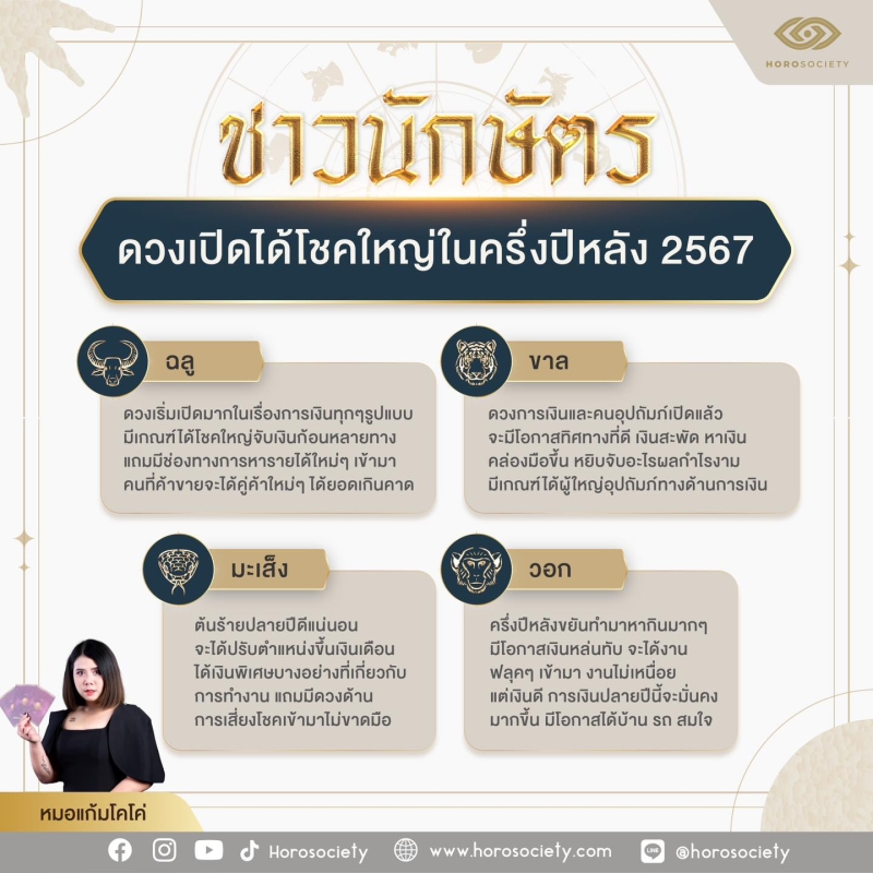 เมื่อวันที่ 23 ก.ค. 67 ที่ผ่านมา ทางเพจ Horosociety โดย หมอแก้มโคโค่ อีกหนึ่งนักทำนายดวงชื่อดัง ได้ออกมาเผยคำทำนายว่า 4 ปี นักษัตร ครึ่งปีหลังสมหวังดั่งใจ ดวงเปิดได้โชคใหญ่
