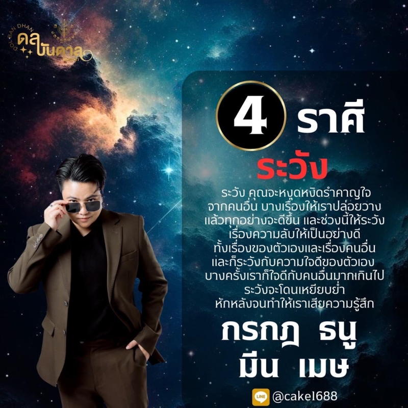 ระวัง คุณจะหงุดหงิดรําคาญใจ จากคนอื่น บางเรื่องให้เราปล่อยวาง แล้วทุกอย่างจะดีขึ้น และช่วงนี้ให้ระวัง เรื่องความลับให้เป็นอย่างดี ทั้งเรื่องของตัวเองและเรื่องคนอื่น และก็ระวังกับความใจดีของตัวเอง บางครั้งเราก็ใจดีกับคนอื่นมากเกินไป ระวังจะโดนเหยียบย่ํา หักหลังจนทําให้เราเสียความรู้สึก