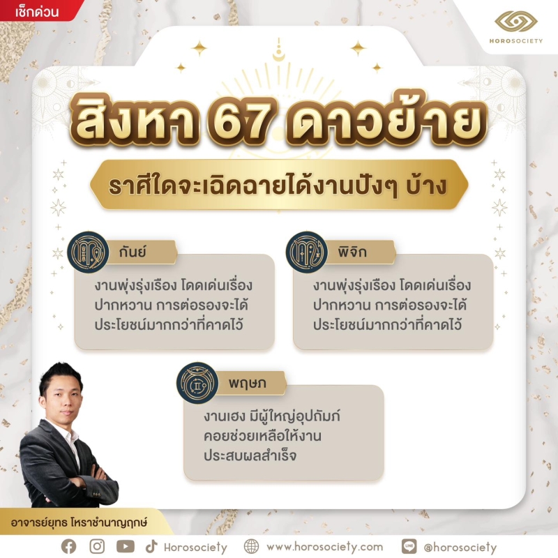 วันที่ 5 ส.ค. 67 ด้านเพจ Horosociety ได้เผย อาจารย์ยุทธ โหราชำนาญฤกษ์ ออกมาทำนายดวงชะตา 3 ราศี เมื่อดาวย้าย จะโดดเด่นดวงปังรับความเฮงแน่นอน
