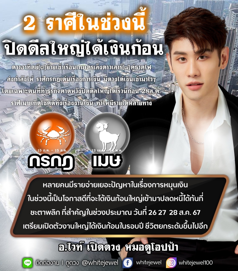 วันที่ 20 ก.ค. 67 ที่ผ่านมา อาจารย์ไวท์เปิดดวง หมอดูโอปป้า เผยในเพจ White Jewel (อาจารย์ไวท์เปิดดวง หมอดูโอปป้า) เผยถึง ดวงชะตา 2 ราศี ช่วงนี้ ปิดดีลใหญ่ได้เงินก้อน ดาวอาทิตย์(๑)ย้ายเข้าเรือนเกษตรเล็งดาวเสาร์(๗) คู่ธาตุไฟ ส่งกําลังให้ ราศีกรกฎเด่นเรื่องการเงิน มีดวงได้เงินเข้ามาไวๆ โดยเฉพาะคนที่ทําธุรกิจคาดหวังปิดดิลใหญ่ได้เร็วนี้ก่อน 28ส.ค. ราศีเมษเกิดโชคดีทั้งเรื่องงานเงิน ทําให้มีรายได้หลายทาง