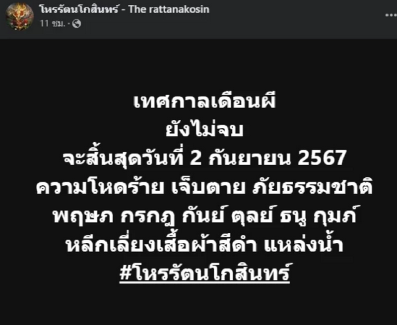 โหรรัตนโกสินทร์ เปิดดวง 6 ราศีต่อไปนี้ เทศกาลเดือนผี ยังไม่จบ ต้องระวังอันตรายจากสิ่งต่างๆ ความเจ็บป่วยจนถึงสิ้นเดือนนี้ รวมถึงภัยธรรมชาติและสิ่งชั่วร้ายอื่นๆ คำทำนายระบุว่า เทศกาลเดือนผียังไม่จบ จะสิ้นสุดวันที่ 2 กันยายน 2567 ความโหดร้าย เจ็บตาย ภัยธรรมชาติ