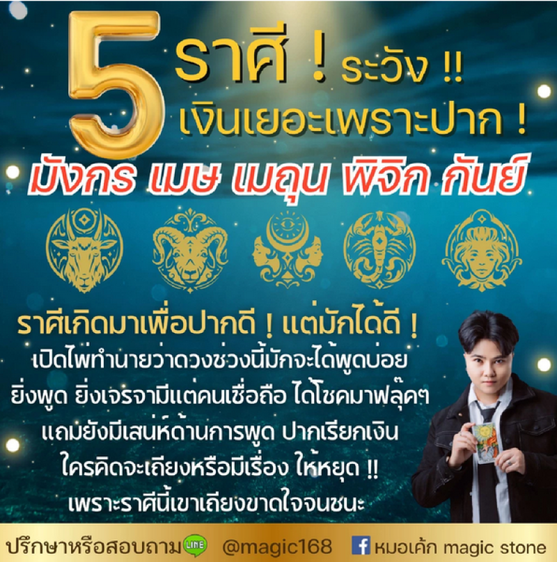 หมอเค้ก Magic stone ผ่าดวง 5 ราศีต่อไปนี้ได้ดีเพราะปาก พูดดีเรียกทรัพย์ คำพูดพารวย ราศีเกิดมาเพื่อปากดี แต่มักได้ดี ! เปิดไพ่ทำนายว่าดวงช่วงนี้มักจะได้พูดบ่อย ยิ่งพูด ยิ่งเจรจามีแต่คนเชื่อถือ ได้โชคมาฟลุ๊กๆ แถมยังมีเสน่ห์ด้านการพูด ปากเรียกเงิน ใครคิดจะเถียงหรือมีเรื่อง ให้หยุด เพราะราศีนี้เขาเถียงขาดใจจนชนะ