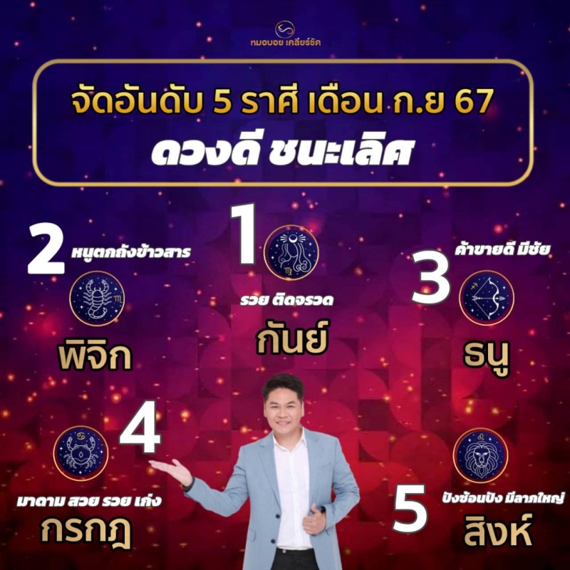 วันที่ 1 ก.ย. 67 ทางเพจ Horosociety โดย หมอบอย เคลียร์ชัด นักดูดวงและราศี ได้ทำนายจัดอันดับ 5 ราศี เดือน กันยายน 2567 ดวงดี ชนะเลิศ จะมีแต่เฮงๆปังๆ จะมีราศีไหนบ้างไปดูกันเลย