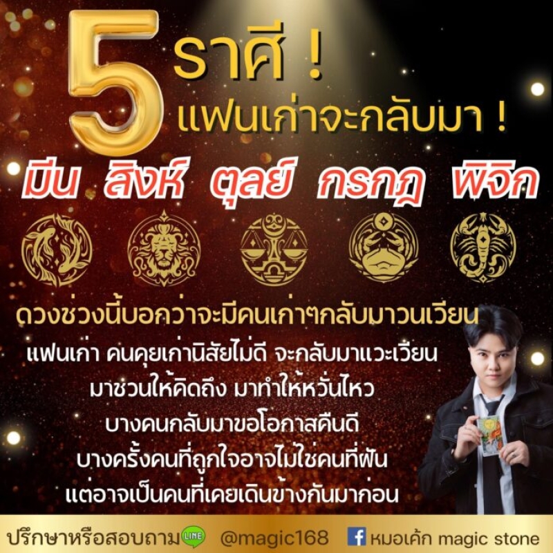หมอเค้ก Magic stone เปิดดวงชะตา 5 ราศี ความวุ่นวายกำลังจะเข้ามาดวงช่วงนี้บอกว่าจะมีคนเก่าๆ กลับมาวนเวียน แฟนเก่า คนคุยเก่านิสัยไม่ดี จะกลับมาแวะเวียน มาชวนให้คิดถึง มาทำให้หวั่นไหว บางคนกลับมาขอโอกาสคืนดี บางครั้งคนที่ถูกใจอาจไม่ใช่คนที่ฝัน แต่อาจเป็นคนที่เคยเดินข้างกันมาก่อน