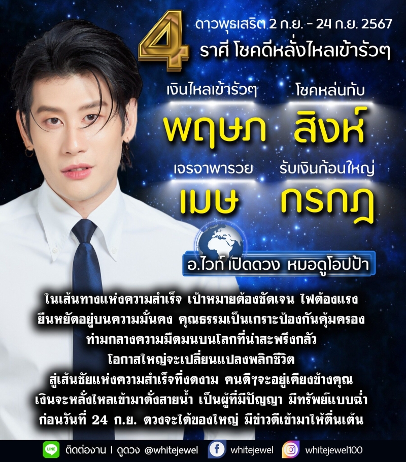 อาจารย์ไวท์เปิดดวง หมอดูโอปป้า เผยในเพจ White Jewel ถึงดาวพุธเสริม 2 ก.ย.- 24 ก.ย.67 โดย 4 ราศีโชคดีหลั่งไหลเข้ารัวๆ เงินไหลเข้ารัวๆ โชคหล่นทับ เจรจาพารวย รับเงินก้อนใหญ่ ในเส้นทางแห่งความสำเร็จ เป้าหมายต้องชัดเจน ไฟต้องแรง ยืนหยัดบนความมั่นคง คุณธรรมเป็นเกราะป้องกันคุ้มครอง ท่ามกลางความมืดมนบนโลกที่น่ากลัว