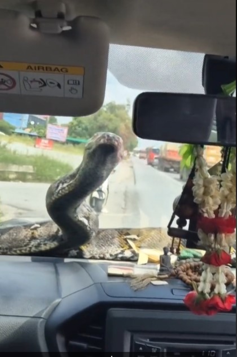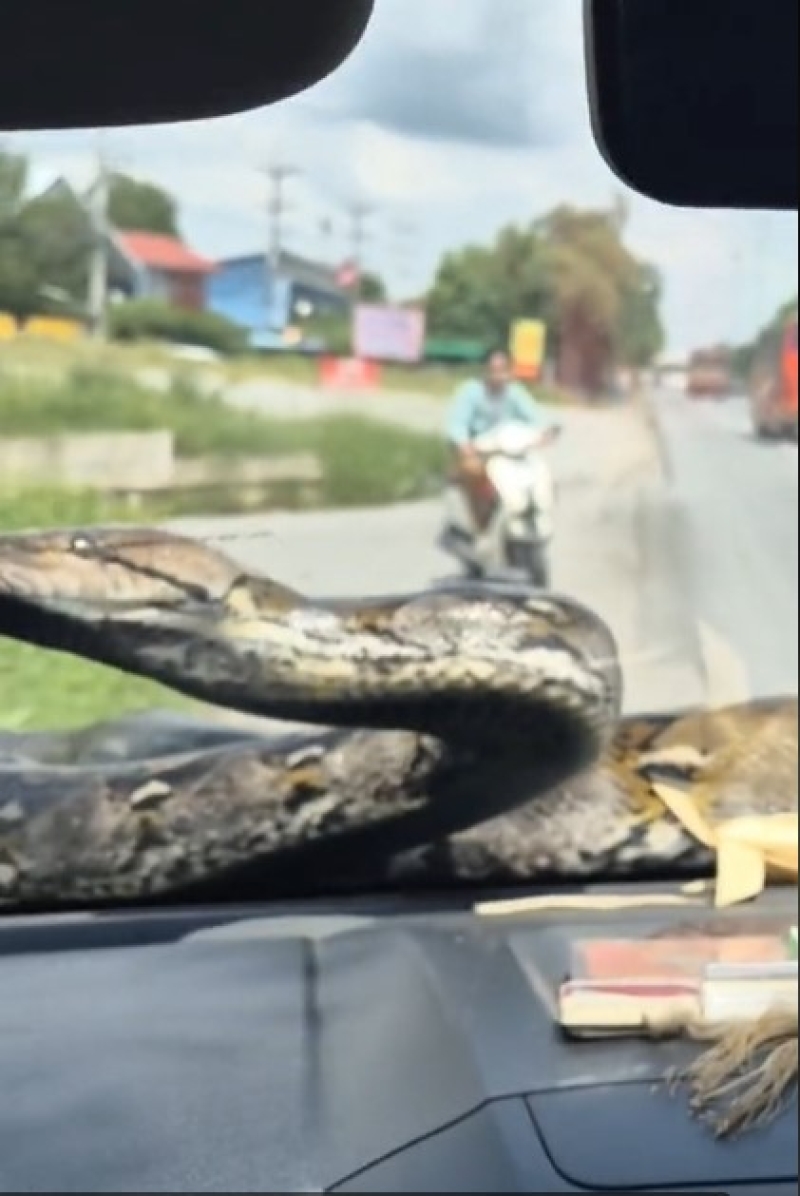 ตัวใหญ่มาก! งูเหลือมโผล่หน้ารถกู้ภัย จับกันให้วุ่น ซูมเลขทะเบียนรถเห็นเต็มๆ