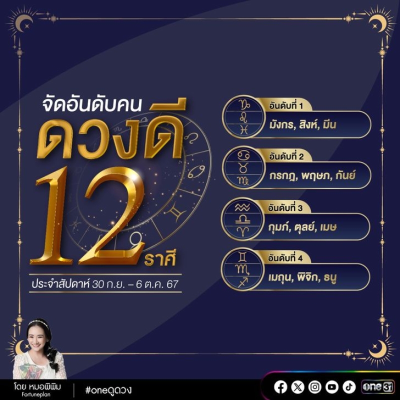 วันที่ 1 ก.ย. 67 หมอพิพิม Fortuneplan นักดูดวงและราศี ได้ทำนายดวง จัดอันดับคนดวงดี 12 ราศี ประจำสัปดาห์ที่ 30 ก.ย. – 6 ต.ค. 67