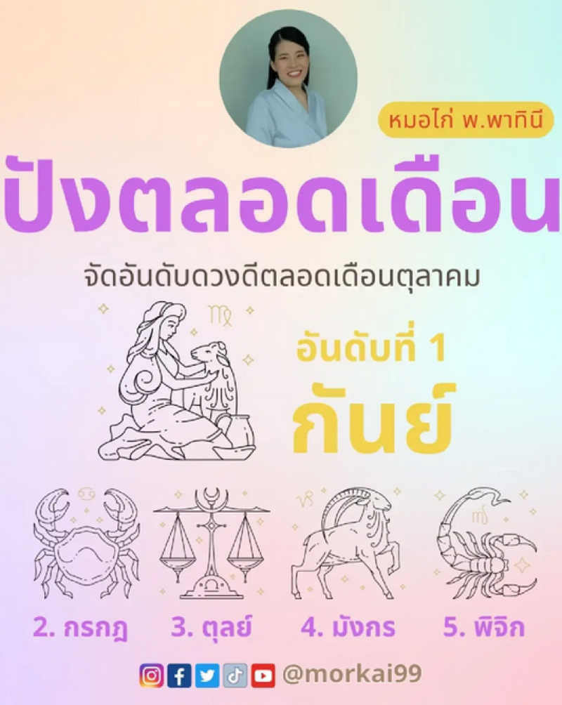 อินสตาแกรม @morkai99 ของ หมอไก่ ได้เผยคำทำนายระบุว่า จัดอันดับดวงดีตลอดเดือนตุลาคม ซึ่งมีดังนี้
