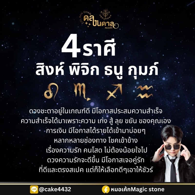 หมอเค้กMagic stone เผยถึงดวงชะตาราศี อยู่ในเกณฑ์ดี มีโอกาสประสบความสำเร็จ ความสำเร็จได้มาเพราะความเก่ง สู้ ลุย ขยันของคุณเอง การเงินมีโอกาสได้รายได้เข้ามาบ่อยๆ หลากหลายช่องทาง โชคเข้าข้างเรื่องความรัก คนโสดไม่ต้องน้อยใจ ดวงความรักจะดีขึ้น มีโอกาสเจอคู่รักที่ดีและตรงสเป๊ก แต่ก็ให้เลือกดีๆ การเงินมีโอกาสได้รายได้เข้ามาบ่อยๆ หลากหลายช่องทาง โชคเข้าข้างเรื่องความรัก คนโสดไม่ต้องน้อยใจ ดวงความรักจะดีขึ้น มีโอกาสเจอคู่รักที่ดีและตรงสเป๊ก แต่ก็ให้เลือกดีๆ