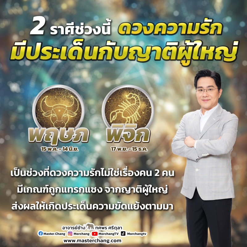 หมอช้าง ทศพร ศรีตุลา เผยคำทำนายถึง 2 ราศี ที่ช่วงนี้ระวังว่าจะมีประเด็นกับผู้ใหญ่ ได้แก่ราศี พฤษภ และราศีพิจิก ราศีพฤษภ (ผู้ที่เกิดตั้งแต่วันที่ 15 พ.ค. - 14 มิ.ย.) และราศีพิจิก (ผู้ที่เกิดตั้งแต่วันที่ 17 พ.ย. - 15 ธ.ค.) เป็นช่วงที่ดวงความรักไม่ใช่เรื่องคน 2 คน มีเกณฑ์ถูกแทรกแซง จากญาติผู้ใหญ่ ส่งผลให้เกิดประเด็นความขัดแย้งตามมา