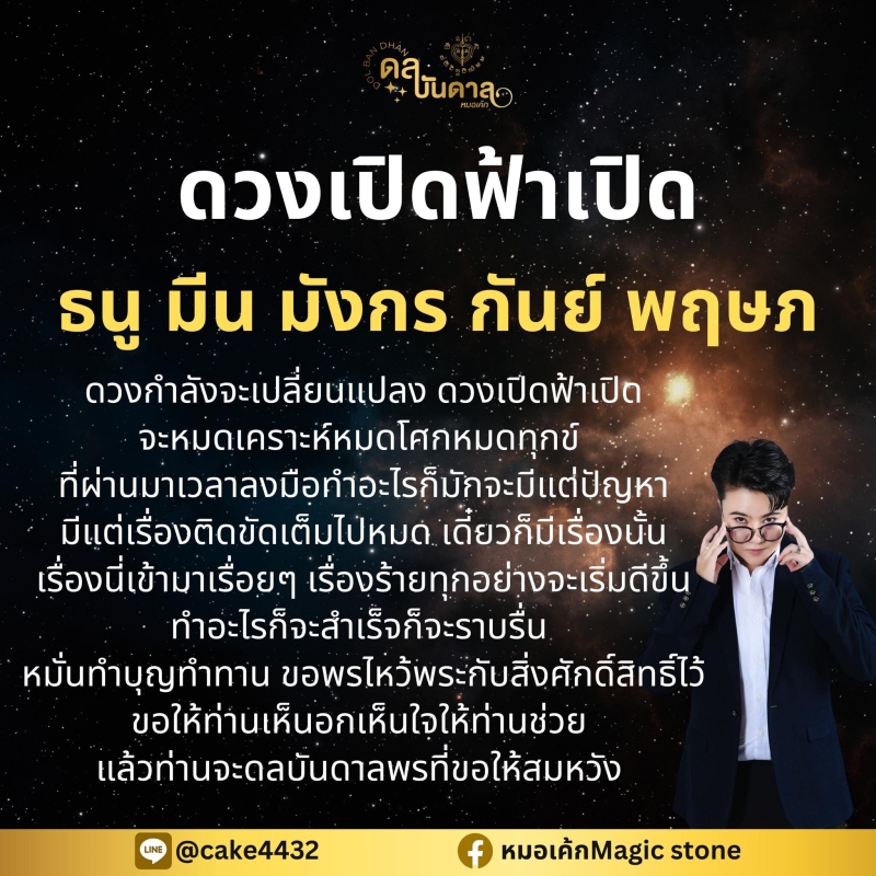 หมอเค้กMagic stone เผยในเพจถึงดวงชะตาราศี ดวงเปิดฟ้าเปิด ดวงกำลังเปลี่ยนแปลง ดวงเปิดฟ้าเปิด จะหมดเคราะห์หมดโศกหมดทุกข์ ที่ผ่านมาเวลาลงมือทำอะไรมักมีแต่ปัญหา มีแต่เรื่องติดขัดเต็มไปหมด เดี๋ยวก็มีเรื่องเข้ามาเรื่อยๆ เรื่องร้ายทุกอย่างจะเริ่มดีขึ้น ทำอะไรก็จะสำเร็จก็จะราบรื่น หมั่นทำบุญทำทาน ขอพรไหว้พระกับสิ่งศักดิ์สิทธิ์ไว้ เรื่องร้ายทุกอย่างจะเริ่มดีขึ้น ทำอะไรก็จะสำเร็จก็จะราบรื่น หมั่นทำบุญทำทาน ขอพรไหว้พระกับสิ่งศักดิ์สิทธิ์ไว้