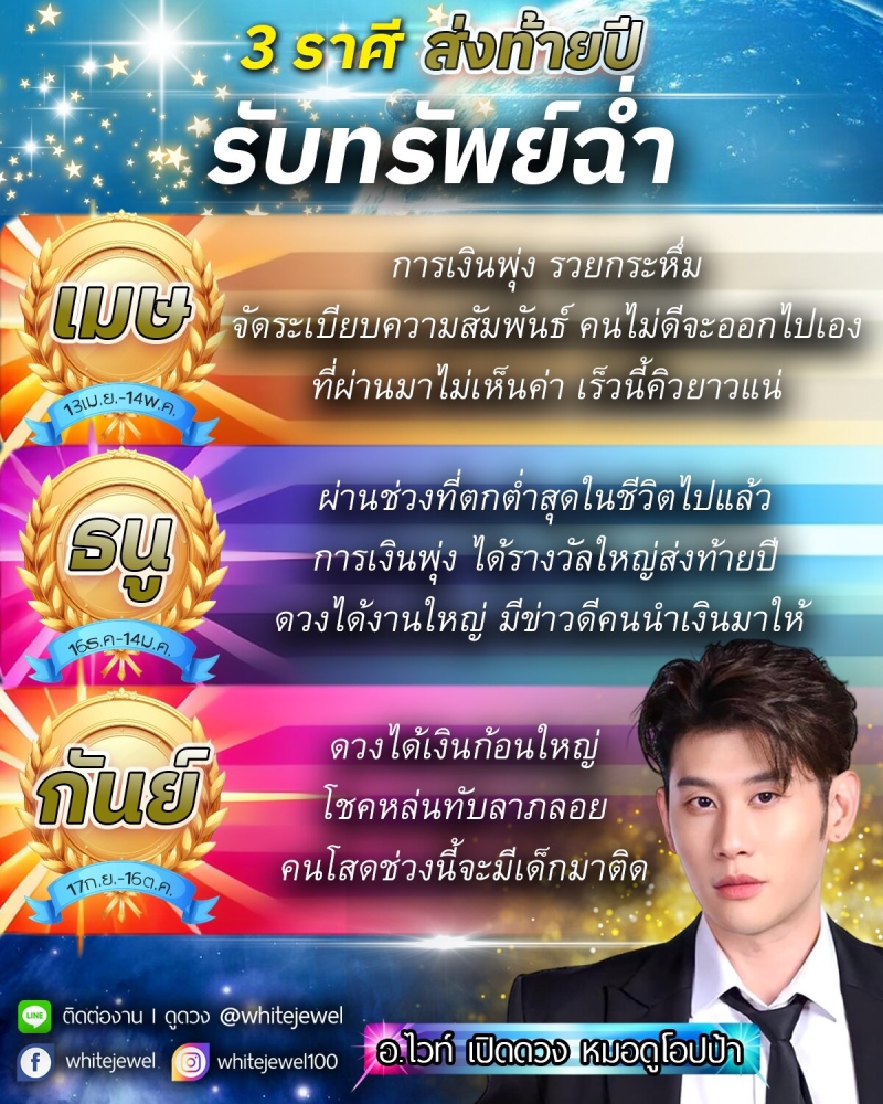 จากกรณี เพจ White Jewel (อาจารย์ไวท์เปิดดวง หมอดูโอปป้า) ถึงดวงชะตา 3 ราศี รับทรัพย์ฉ่ำส่งท้ายปี การเงินพุ่ง รวยกระหึ่ม จัดระเบียบความสัมพันธ์ คนไม่ดีจะออกไปเอง ที่ผ่านมาไม่เห็นค่า เร็วนี้คิวยาวแน่