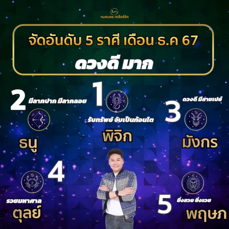วันที่ 2 ธ.ค. 67 ที่ผ่านมา ทางหมอบอย เคลียร์ชัด นักดูดวงและราศี ได้จัดอับดับ 5 ราศี โค้งสุดท้าย ส่งท้ายปี ดวงดีมาก